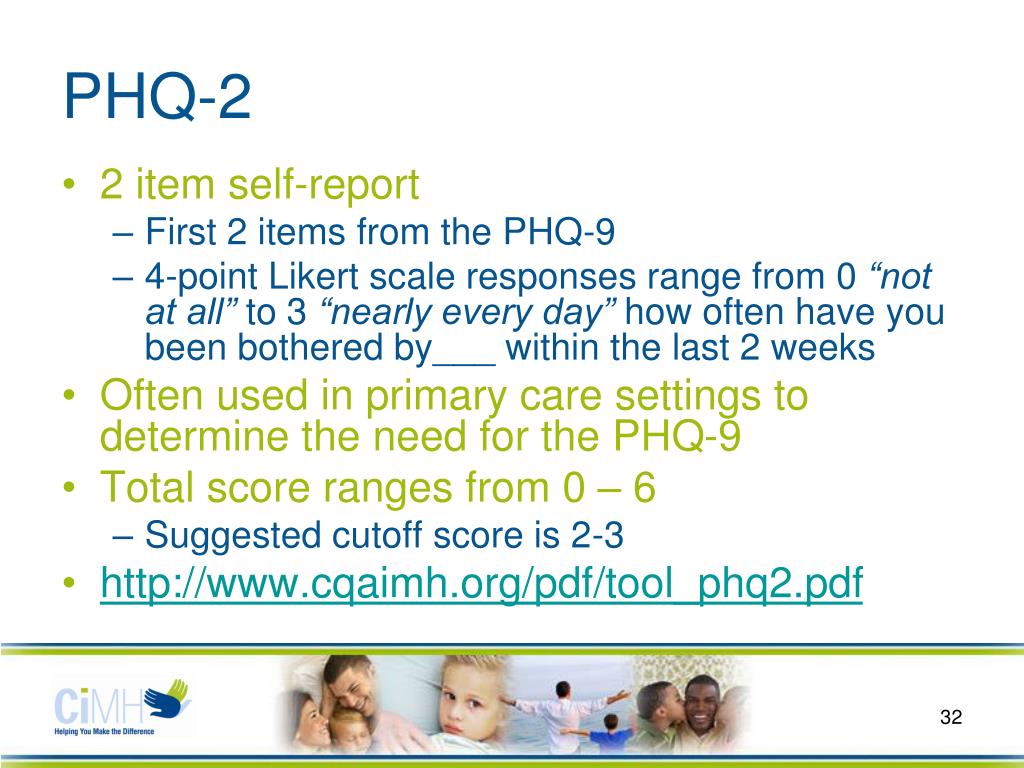 PHQ-2 • 2 item self-report • First 2 items from the PHQ-9 • 4-point Likert scale responses range from 0 “not at all” to 3 “nearly every day” how often have you been bothered by___ within the last 2 weeks • Often used in primary care settings to determine the need for the PHQ-9 • Total score ranges from 0 – 6 • Suggested cutoff score is 2-3 • http://www.cqaimh.org/pdf/tool_phq2.pdf