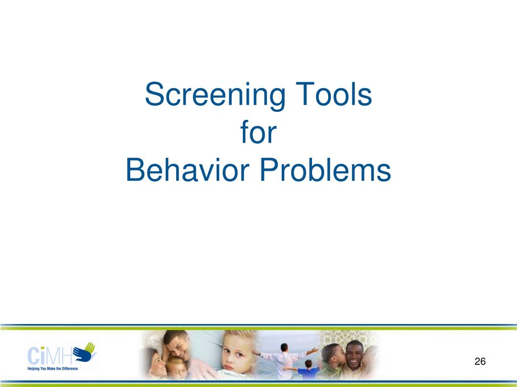 Selecting a Screening Tool • Select adequate screening tools • Sensitivity and specificity rates of at least 70% • Reliable, valid, and standardized on diverse populations • Feasibility issues (cost, time to complete, time to score)