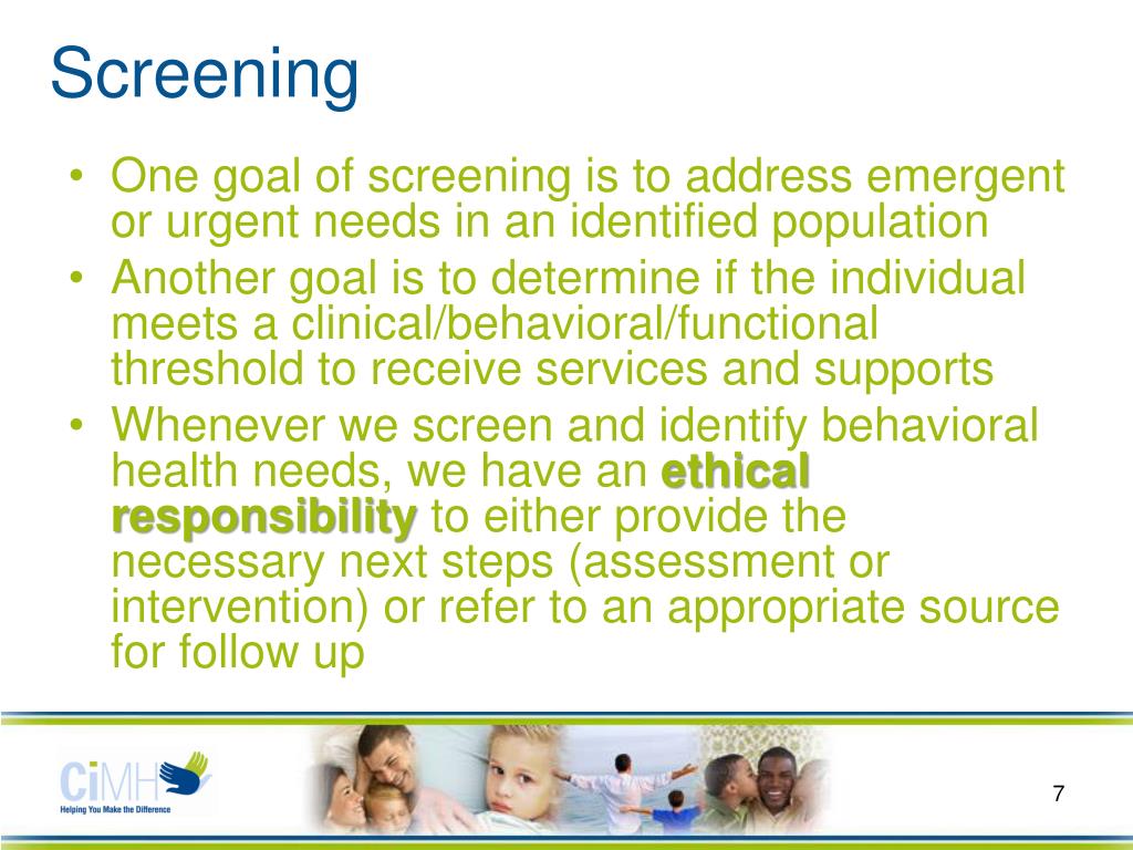 Screening • One goal of screening is to address emergent or urgent needs in an identified population • Another goal is to determine if the individual meets a clinical/behavioral/functional threshold to receive services and supports • Whenever we screen and identify behavioral health needs, we have an ethical responsibility to either provide the necessary next steps (assessment or intervention) or refer to an appropriate source for follow up