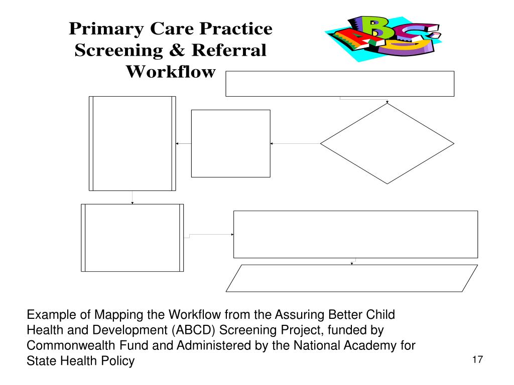 Example of Mapping the Workflow from the Assuring Better Child Health and Development (ABCD) Screening Project, funded by Commonwealth Fund and Administered by the National Academy for State Health Policy