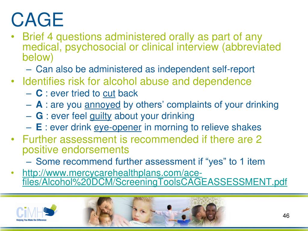 CAGE • Brief 4 questions administered orally as part of any medical, psychosocial or clinical interview (abbreviated below) • Can also be administered as independent self-report • Identifies risk for alcohol abuse and dependence • C : ever tried to cut back • A : are you annoyed by others’ complaints of your drinking • G : ever feel guilty about your drinking • E : ever drink eye-opener in morning to relieve shakes • Further assessment is recommended if there are 2 positive endorsements • Some recommend further assessment if “yes” to 1 item • http://www.mercycarehealthplans.com/ace-files/Alcohol%20DCM/ScreeningToolsCAGEASSESSMENT.pdf