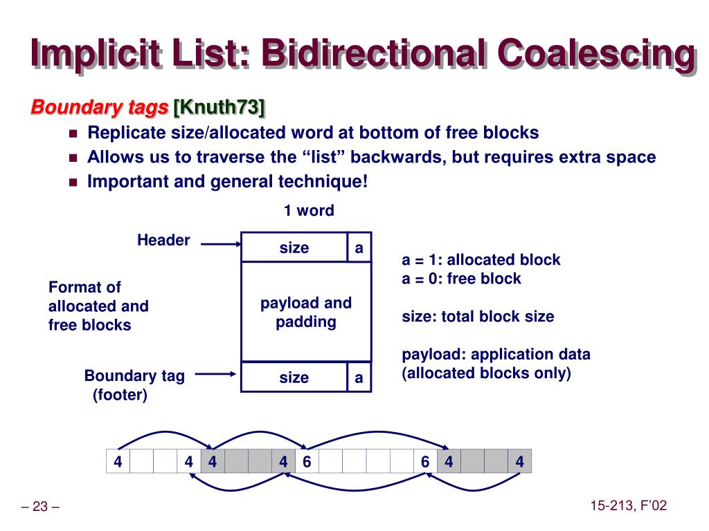 Implicit List: Bidirectional Coalescing • Boundary tags [Knuth73] • Replicate size/allocated word at bottom of free blocks • Allows us to traverse the “list” backwards, but requires extra space • Important and general technique! 1 word Header size a a = 1: allocated block a = 0: free block size: total block size payload: application data (allocated blocks only) payload and padding Format of allocated and free blocks Boundary tag (footer) size a 4 4 4 4 6 6 4 4