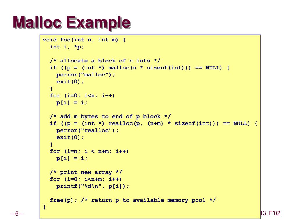 Malloc Example void foo(int n, int m) { int i, *p; /* allocate a block of n ints */ if ((p = (int *) malloc(n * sizeof(int))) == NULL) { perror("malloc"); exit(0); } for (i=0; i<n; i++) p[i] = i; /* add m bytes to end of p block */ if ((p = (int *) realloc(p, (n+m) * sizeof(int))) == NULL) { perror("realloc"); exit(0); } for (i=n; i < n+m; i++) p[i] = i; /* print new array */ for (i=0; i<n+m; i++) printf("%d\n", p[i]); free(p); /* return p to available memory pool */ }