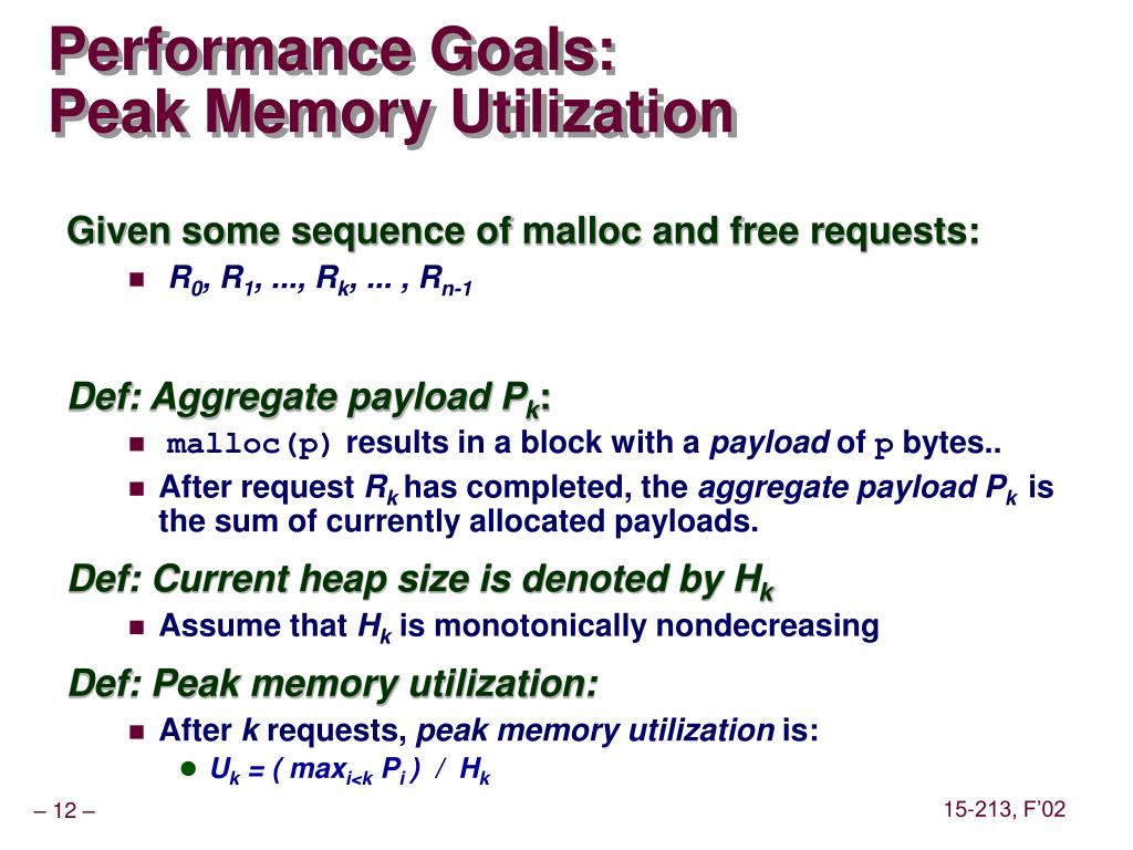 Performance Goals: Peak Memory Utilization • Given some sequence of malloc and free requests: • R0, R1, ..., Rk, ... , Rn-1 • Def: Aggregate payload Pk: • malloc(p) results in a block with a payload of p bytes.. • After request Rk has completed, the aggregate payloadPk is the sum of currently allocated payloads. • Def: Current heap size is denoted by Hk • Assume that Hk is monotonically nondecreasing • Def: Peak memory utilization: • After k requests, peak memory utilization is: • Uk = ( maxi<k Pi ) / Hk