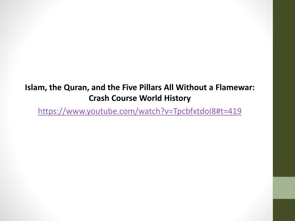 Islam, the Quran, and the Five Pillars All Without a Flamewar: Crash Course World History https://www.youtube.com/watch?v=TpcbfxtdoI8#t=419