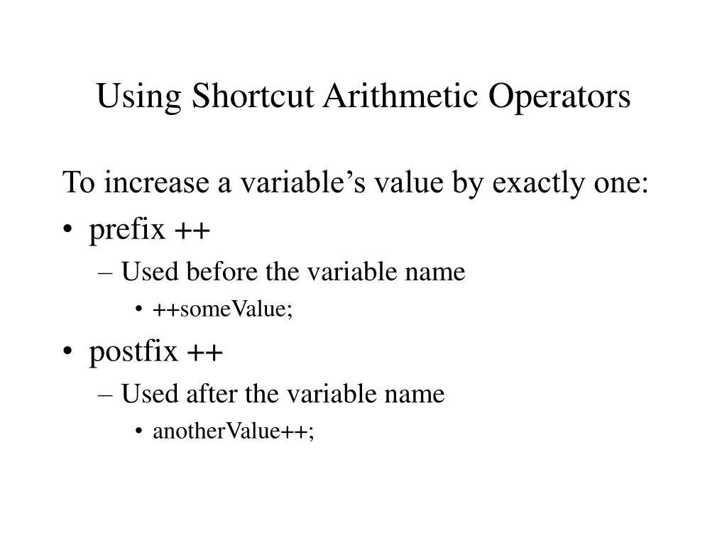 Using Shortcut Arithmetic Operators To increase a variable’s value by exactly one: • prefix ++ • Used before the variable name • ++someValue; • postfix ++ • Used after the variable name • anotherValue++;