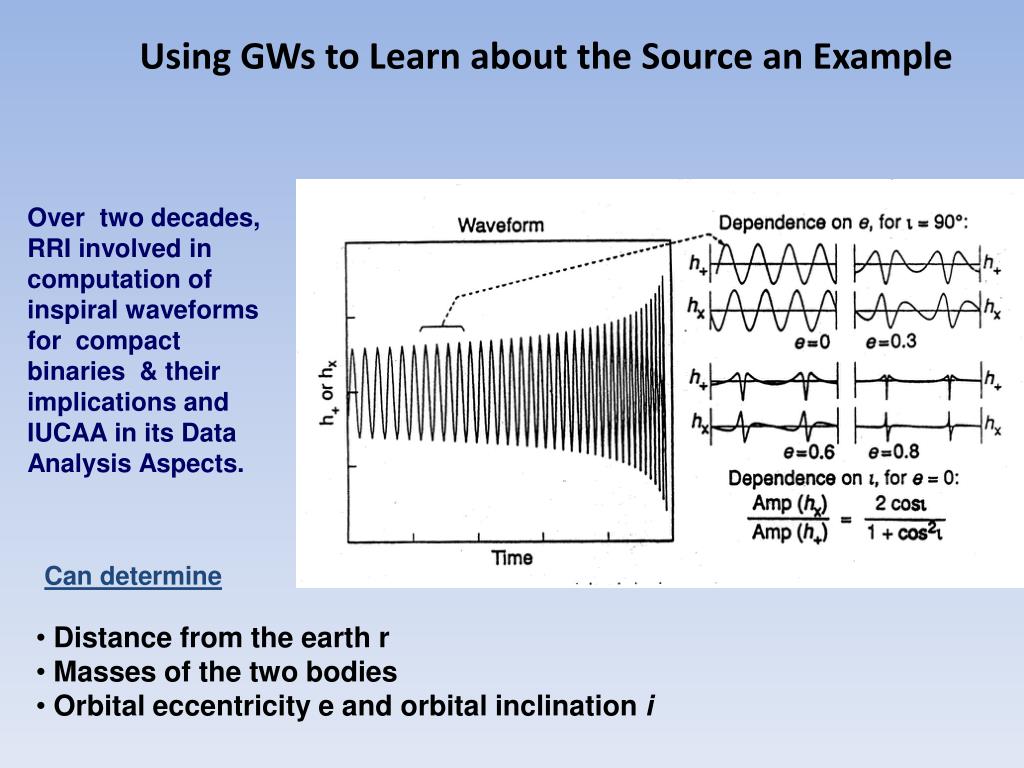 Using GWs to Learn about the Source an Example Over two decades, RRI involved in computation of inspiral waveforms for compact binaries & their implications and IUCAA in its Data Analysis Aspects. Can determine • Distance from the earth r • Masses of the two bodies • Orbital eccentricity e and orbital inclination i