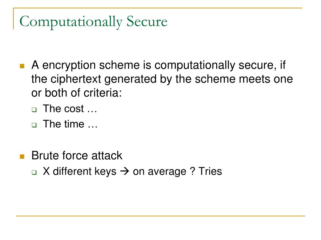 Computationally Secure • A encryption scheme is computationally secure, if the ciphertext generated by the scheme meets one or both of criteria: • The cost … • The time … • Brute force attack • X different keys on average ? Tries