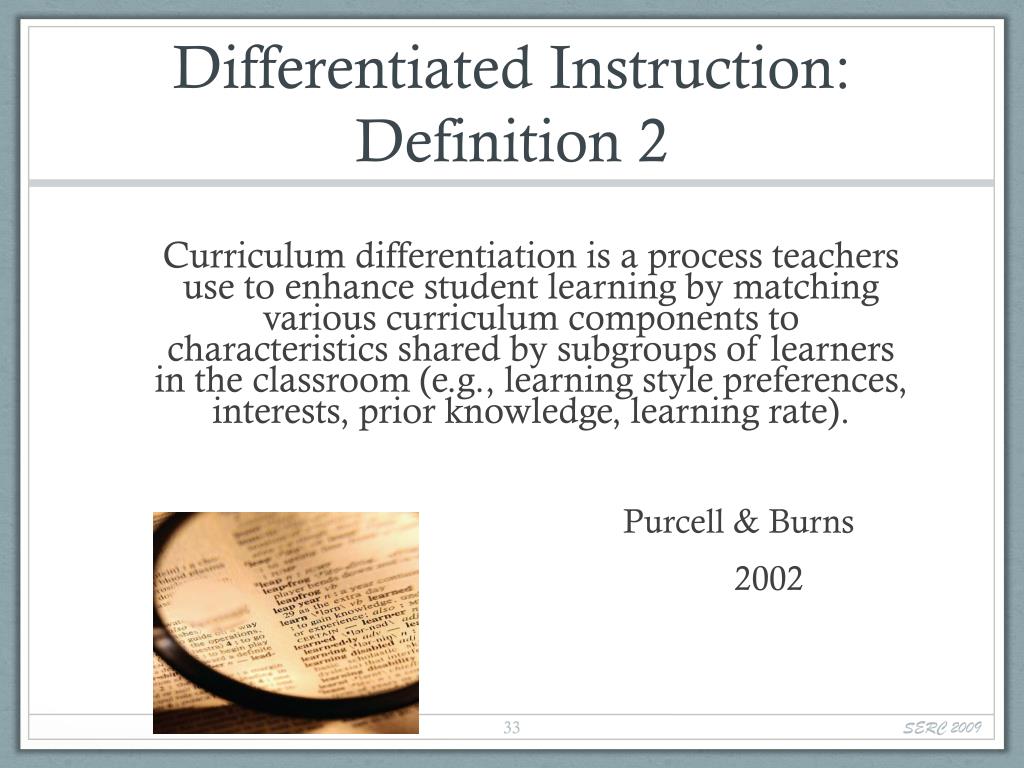 Differentiated Instruction: Definition 2 Curriculum differentiation is a process teachers use to enhance student learning by matching various curriculum components to characteristics shared by subgroups of learners in the classroom (e.g., learning style preferences, interests, prior knowledge, learning rate). Purcell & Burns 2002 SERC 2009