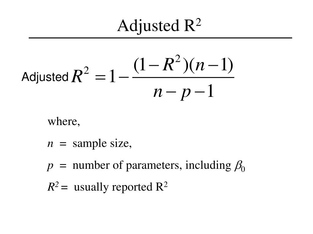 Adjusted R2 Adjusted where, n = sample size, p = number of parameters, including 0 R2= usually reported R2