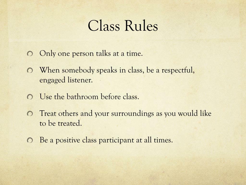 Class Rules • Only one person talks at a time. • When somebody speaks in class, be a respectful, engaged listener. • Use the bathroom before class. • Treat others and your surroundings as you would like to be treated. • Be a positive class participant at all times.