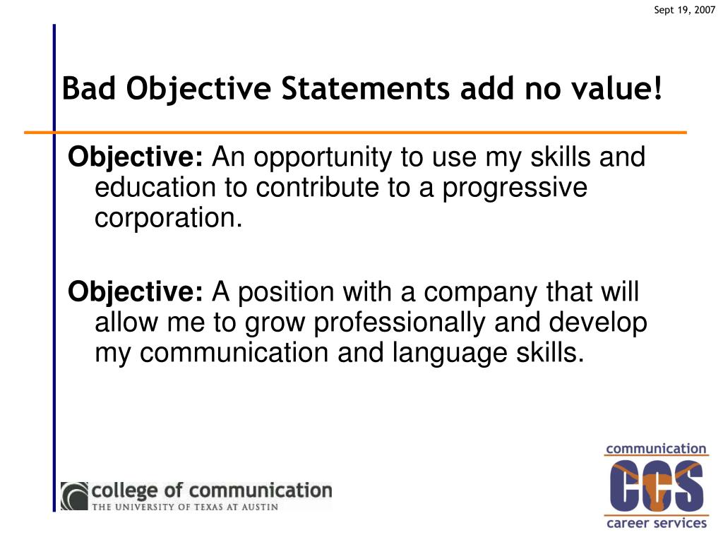 Bad Objective Statements add no value! Objective: An opportunity to use my skills and education to contribute to a progressive corporation. Objective: A position with a company that will allow me to grow professionally and develop my communication and language skills.