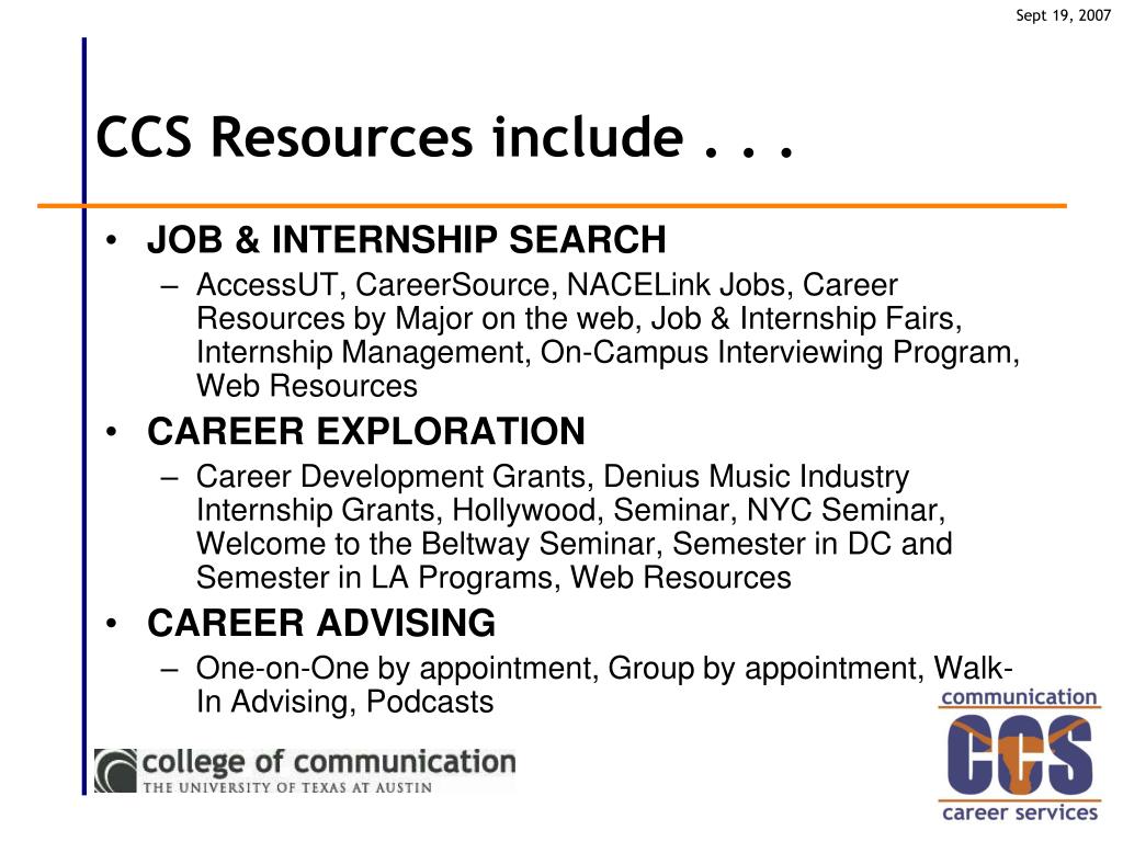 CCS Resources include . . . • JOB & INTERNSHIP SEARCH • AccessUT, CareerSource, NACELink Jobs, Career Resources by Major on the web, Job & Internship Fairs, Internship Management, On-Campus Interviewing Program, Web Resources • CAREER EXPLORATION • Career Development Grants, Denius Music Industry Internship Grants, Hollywood, Seminar, NYC Seminar, Welcome to the Beltway Seminar, Semester in DC and Semester in LA Programs, Web Resources • CAREER ADVISING • One-on-One by appointment, Group by appointment, Walk-In Advising, Podcasts