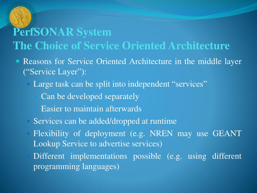 PerfSONAR SystemThe Choice of Service Oriented Architecture • Reasons for Service Oriented Architecture in the middle layer (“Service Layer”): • Large task can be split into independent “services” • Can be developed separately • Easier to maintain afterwards • Services can be added/dropped at runtime • Flexibility of deployment (e.g. NREN may use GEANT Lookup Service to advertise services) • Different implementations possible (e.g. using different programming languages)