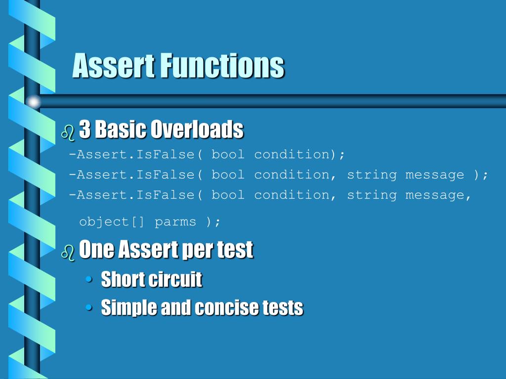 Assert Functions • 3 Basic Overloads -Assert.IsFalse( bool condition); -Assert.IsFalse( bool condition, string message ); -Assert.IsFalse( bool condition, string message, object[] parms ); • One Assert per test • Short circuit • Simple and concise tests