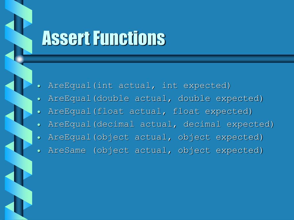 Assert Functions • AreEqual(int actual, int expected) • AreEqual(double actual, double expected) • AreEqual(float actual, float expected) • AreEqual(decimal actual, decimal expected) • AreEqual(object actual, object expected) • AreSame (object actual, object expected)