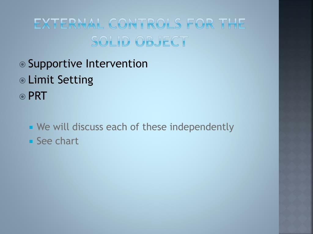 External Controls for the Solid Object • Supportive Intervention • Limit Setting • PRT • We will discuss each of these independently • See chart