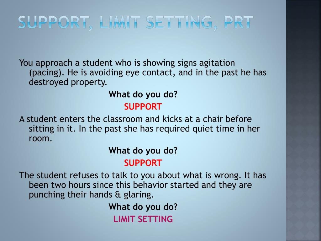 Support, Limit Setting, PRT You approach a student who is showing signs agitation (pacing). He is avoiding eye contact, and in the past he has destroyed property. What do you do? SUPPORT A student enters the classroom and kicks at a chair before sitting in it. In the past she has required quiet time in her room. What do you do? SUPPORT The student refuses to talk to you about what is wrong. It has been two hours since this behavior started and they are punching their hands & glaring. What do you do? LIMIT SETTING