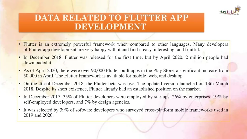 DATA RELATED TO FLUTTER APP DEVELOPMENT • Flutter is an extremely powerful framework when compared to other languages. Many developers of Flutter app development are very happy with it and find it easy, interesting, and fruitful. • In December 2018, Flutter was released for the first time, but by April 2020, 2 million people had downloaded it. • As of April 2020, there were over 90,000 Flutter-built apps in the Play Store, a significant increase from 50,000 in April. The Flutter Framework is available for mobile, web, and desktop. • On the 4th of December 2018, the Flutter beta was live. The updated version launched on 13th March 2018. Despite its short existence, Flutter already had an established position on the market. • In December 2017, 35% of Flutter developers were employed by startups, 26% by enterprises, 19% by self-employed developers, and 7% by design agencies. • It was selected by 39% of software developers who surveyed cross-platform mobile frameworks used in 2019 and 2020.