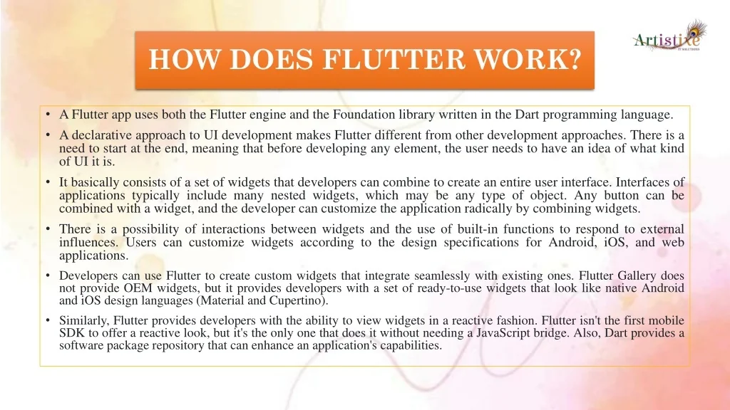 HOW DOES FLUTTER WORK? • A Flutter app uses both the Flutter engine and the Foundation library written in the Dart programming language. • A declarative approach to UI development makes Flutter different from other development approaches. There is a need to start at the end, meaning that before developing any element, the user needs to have an idea of what kind of UI it is. • It basically consists of a set of widgets that developers can combine to create an entire user interface. Interfaces of applications typically include many nested widgets, which may be any type of object. Any button can be combined with a widget, and the developer can customize the application radically by combining widgets. • There is a possibility of interactions between widgets and the use of built-in functions to respond to external influences. Users can customize widgets according to the design specifications for Android, iOS, and web applications. • Developers can use Flutter to create custom widgets that integrate seamlessly with existing ones. Flutter Gallery does not provide OEM widgets, but it provides developers with a set of ready-to-use widgets that look like native Android and iOS design languages (Material and Cupertino). • Similarly, Flutter provides developers with the ability to view widgets in a reactive fashion. Flutter isn't the first mobile SDK to offer a reactive look, but it's the only one that does it without needing a JavaScript bridge. Also, Dart provides a software package repository that can enhance an application's capabilities.