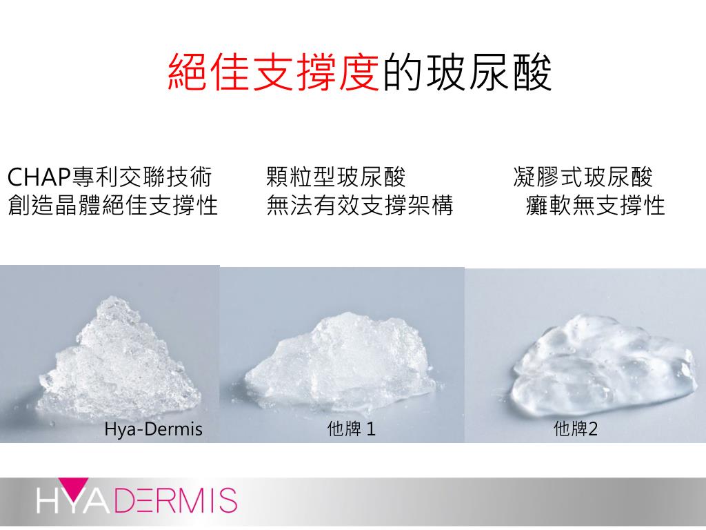 絕佳支撐度的玻尿酸 CHAP專利交聯技術 顆粒型玻尿酸 凝膠式玻尿酸 創造晶體絕佳支撐性 無法有效支撐架構 癱軟無支撐性 Hya-Dermis 他牌 1 他牌2