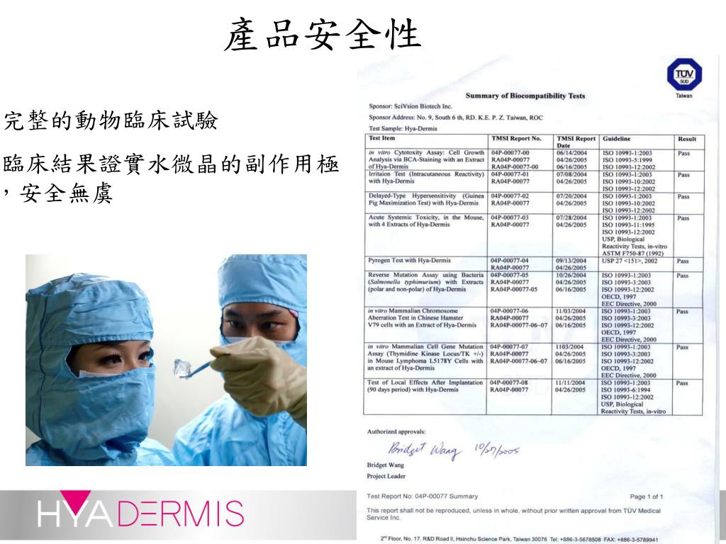 水微晶通過完整生物相容性評估 科妍公司考量Hya-Dermis的化學特性,植入體內的性質、程度、頻率與時間,依據 國際標準「 ISO 10993 醫療器材生物學評估」進行 9 項生物相容性測試,證實Hya-Dermis生物相容性佳。 委託試驗單位:TUV Medical Service, Inc. 試驗項目: SciVision Biotech Inc.