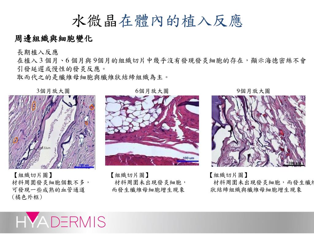水微晶在體內的植入反應 周邊組織與細胞變化 長期植入反應 在植入 3 個月、6 個月與 9個月的組織切片中幾乎沒有發現發炎細胞的存在,顯示海德密絲不會引發延遲或慢性的發炎反應。 取而代之的是纖維母細胞與纖維狀結締組織為主。 3個月放大圖 6個月放大圖 9個月放大圖 【組織切片圖】 材料周圍發炎細胞個數不多, 可發現一些成熟的血管通道 (橘色外框) 【組織切片圖】 材料周圍未出現發炎細胞, 而發生纖維母細胞增生現象 【組織切片圖】 材料周圍未出現發炎細胞,而發生纖維 狀結締組織與纖維母細胞增生現象