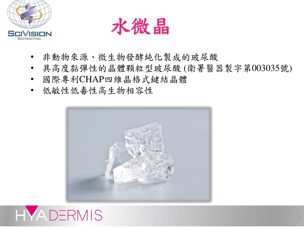 水微晶 • 非動物來源、微生物發酵純化製成的玻尿酸 • 具高度黏彈性的晶體顆粒型玻尿酸 (衛署醫器製字第003035號) • 國際專利CHAP四維晶格式鍵結晶體 • 低敏性低毒性高生物相容性