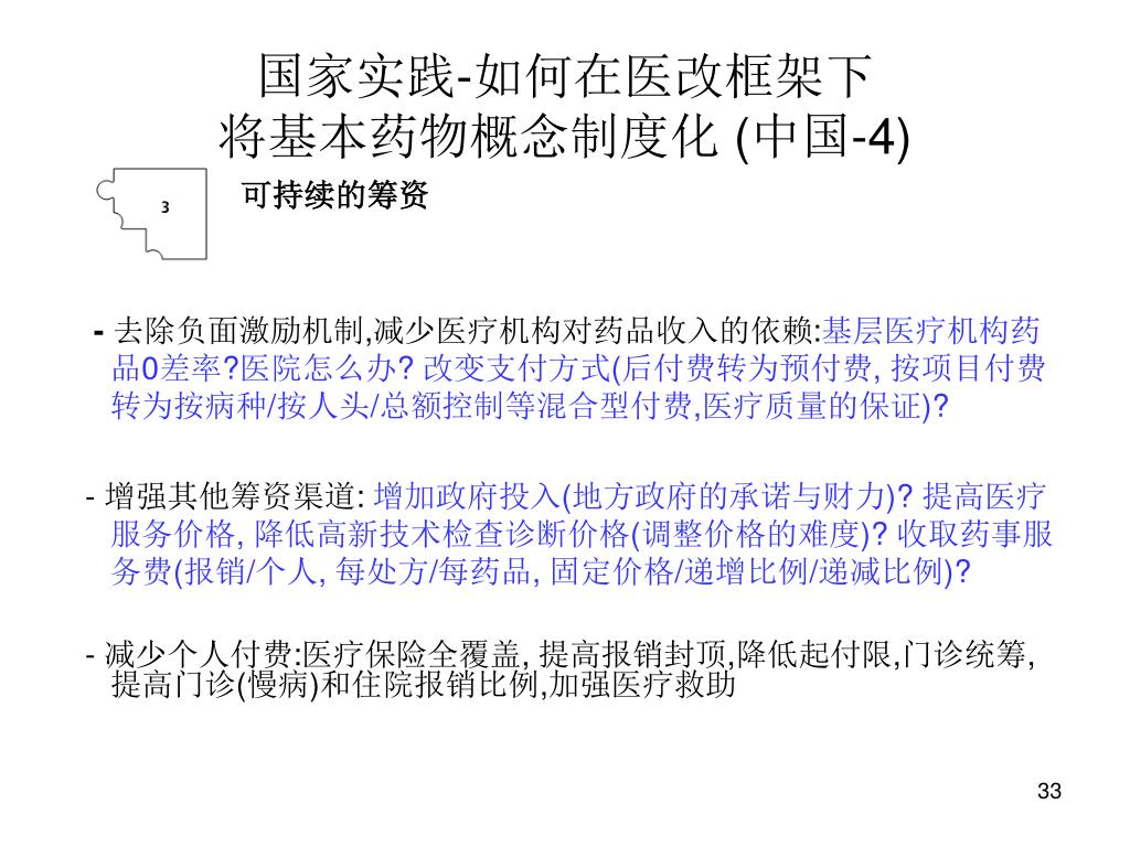 国家实践-如何在医改框架下将基本药物概念制度化 (中国-4) 可持续的筹资 - 去除负面激励机制,减少医疗机构对药品收入的依赖:基层医疗机构药品0差率?医院怎么办?改变支付方式(后付费转为预付费, 按项目付费转为按病种/按人头/总额控制等混合型付费,医疗质量的保证)? - 增强其他筹资渠道: 增加政府投入(地方政府的承诺与财力)? 提高医疗服务价格, 降低高新技术检查诊断价格(调整价格的难度)? 收取药事服务费(报销/个人, 每处方/每药品, 固定价格/递增比例/递减比例)? - 减少个人付费:医疗保险全覆盖, 提高报销封顶,降低起付限,门诊统筹,提高门诊(慢病)和住院报销比例,加强医疗救助