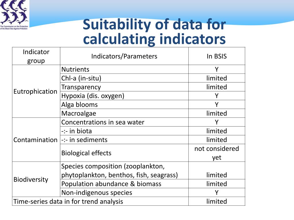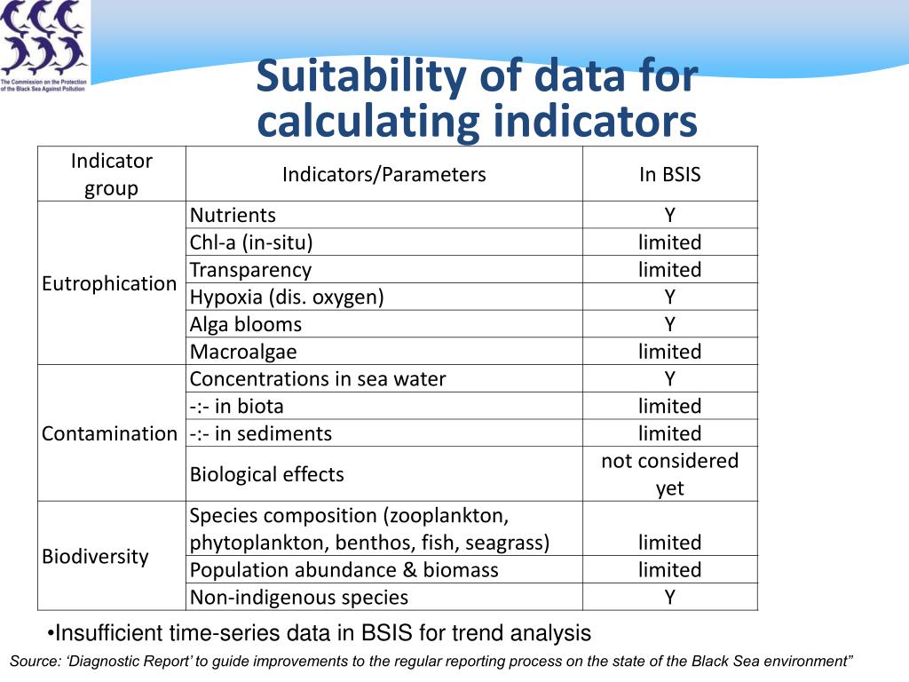 Suitability of data for calculating indicators • Insufficient time-series data in BSIS for trend analysis Source: ‘Diagnostic Report’ to guide improvements to the regular reporting process on the state of the Black Sea environment”