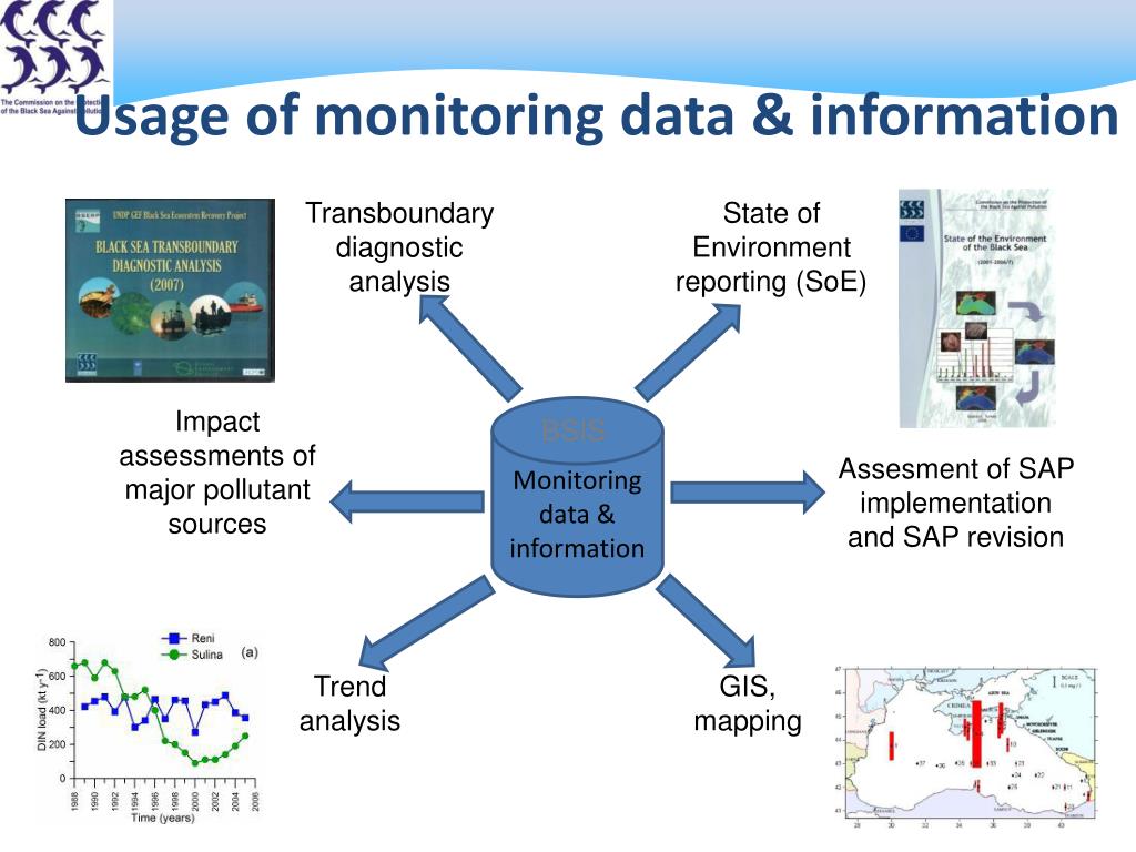Usage of monitoring data & information Transboundary diagnostic analysis State of Environment reporting (SoE) Impact assessments of major pollutant sources Monitoring data & information BSIS Assesment of SAP implementation and SAP revision Trend analysis GIS, mapping