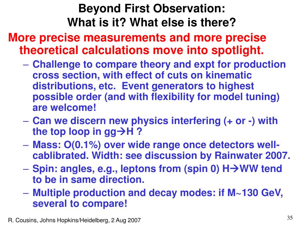 Beyond First Observation: What is it? What else is there? More precise measurements and more precise theoretical calculations move into spotlight. • Challenge to compare theory and expt for production cross section, with effect of cuts on kinematic distributions, etc. Event generators to highest possible order (and with flexibility for model tuning) are welcome! • Can we discern new physics interfering (+ or -) with the top loop in ggH ? • Mass: O(0.1%) over wide range once detectors well-cablibrated. Width: see discussion by Rainwater 2007. • Spin: angles, e.g., leptons from (spin 0) HWW tend to be in same direction. • Multiple production and decay modes: if M~130 GeV, several to compare!
