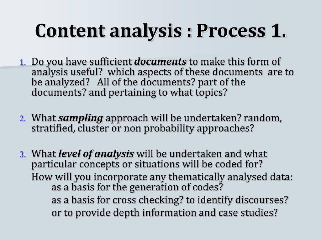 Content analysis : Process 1. • Do you have sufficient documents to make this form of analysis useful? which aspects of these documents are to be analyzed? All of the documents? part of the documents? and pertaining to what topics? • What sampling approach will be undertaken? random, stratified, cluster or non probability approaches? • What level of analysis will be undertaken and what particular concepts or situations will be coded for? How will you incorporate any thematically analysed data: as a basis for the generation of codes? as a basis for cross checking? to identify discourses? or to provide depth information and case studies?