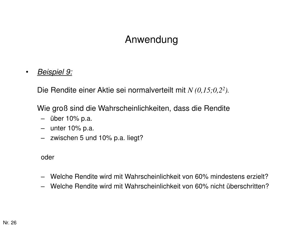Anwendung • Beispiel 9:Die Rendite einer Aktie sei normalverteilt mit N (0,15;0,22).Wie groß sind die Wahrscheinlichkeiten, dass die Rendite • über 10% p.a. • unter 10% p.a. • zwischen 5 und 10% p.a. liegt? oder • Welche Rendite wird mit Wahrscheinlichkeit von 60% mindestens erzielt? • Welche Rendite wird mit Wahrscheinlichkeit von 60% nicht überschritten?