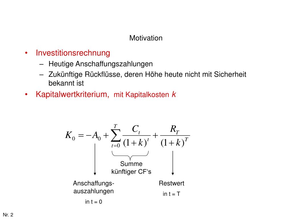 Summe künftiger CF‘s Anschaffungs-auszahlungen in t = 0 Restwert in t = T Motivation • Investitionsrechnung • Heutige Anschaffungszahlungen • Zukünftige Rückflüsse, deren Höhe heute nicht mit Sicherheit bekannt ist • Kapitalwertkriterium, mit Kapitalkostenk