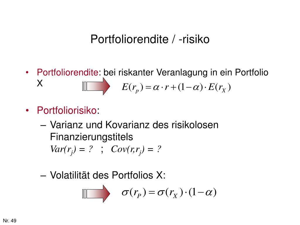 Portfoliorendite / -risiko • Portfoliorendite: bei riskanter Veranlagung in ein Portfolio X • Portfoliorisiko: • Varianz und Kovarianz des risikolosen FinanzierungstitelsVar(rj) = ? ; Cov(r,rj) = ? • Volatilität des Portfolios X: