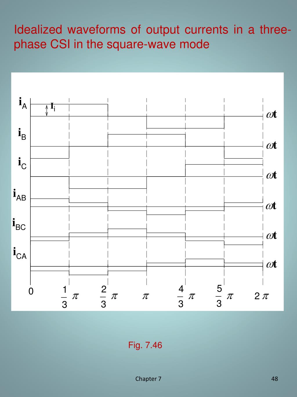 Idealized waveforms of output currents in a three-phase CSI in the square-wave mode Fig. 7.46 Chapter 7