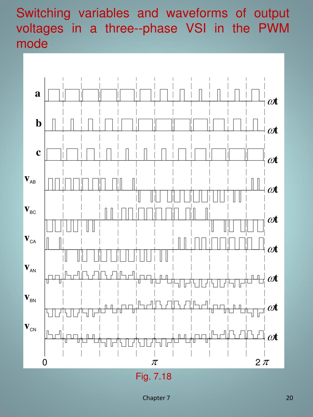 Switching variables and waveforms of output voltages in a three--phase VSI in the PWM mode Fig. 7.18 Chapter 7