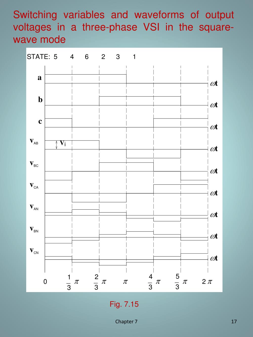 Switching variables and waveforms of output voltages in a three-phase VSI in the square-wave mode Fig. 7.15 Chapter 7