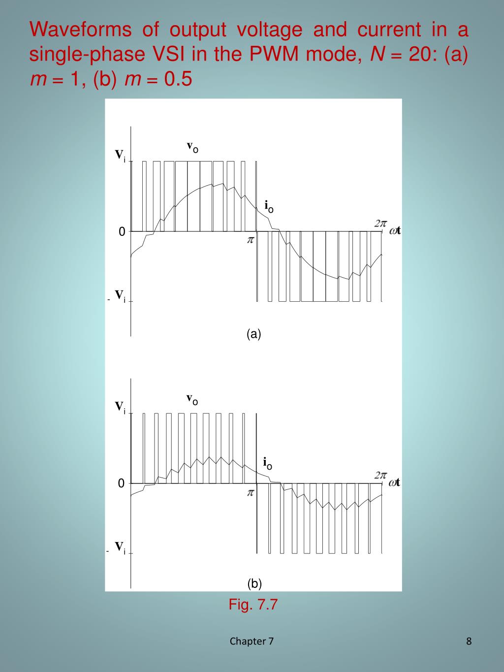 Waveforms of output voltage and current in a single-phase VSI in the PWM mode, N = 20: (a) m = 1, (b) m = 0.5 Fig. 7.7 Chapter 7