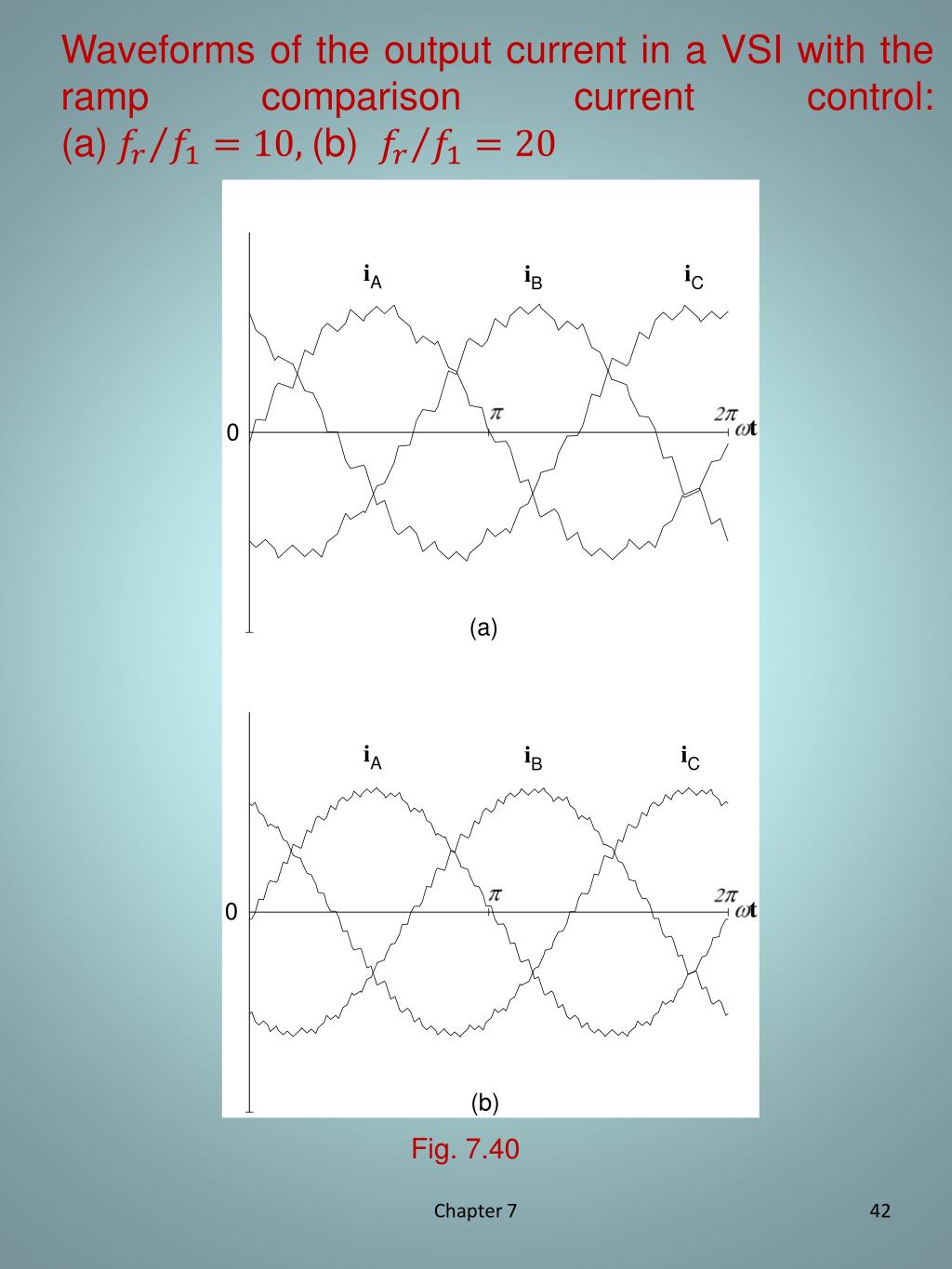 Waveforms of the output current in a VSI with the ramp comparison current control: (a)(b) Fig. 7.40 Chapter 7