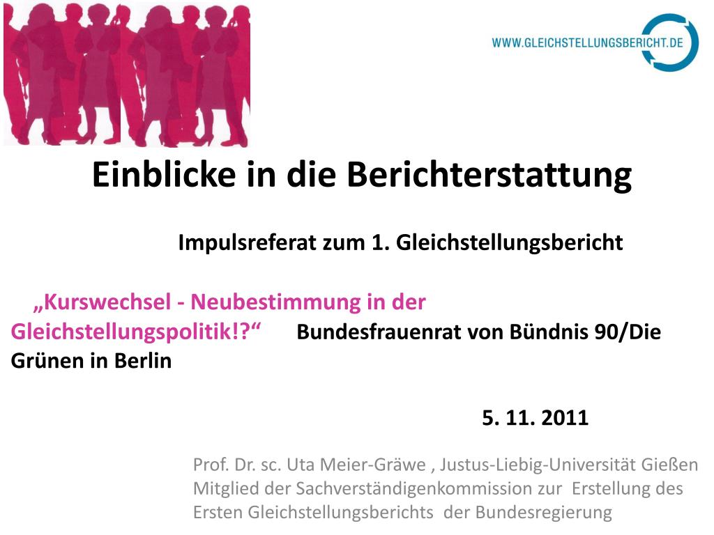 Einblicke in die Berichterstattung Impulsreferat zum 1. Gleichstellungsbericht „Kurswechsel - Neubestimmung in der Gleichstellungspolitik!?“Bundesfrauenrat von Bündnis 90/Die Grünen in Berlin 5. 11. 2011 Prof. Dr. sc. Uta Meier-Gräwe , Justus-Liebig-Universität Gießen Mitglied der Sachverständigenkommission zur Erstellung des Ersten Gleichstellungsberichts der Bundesregierung