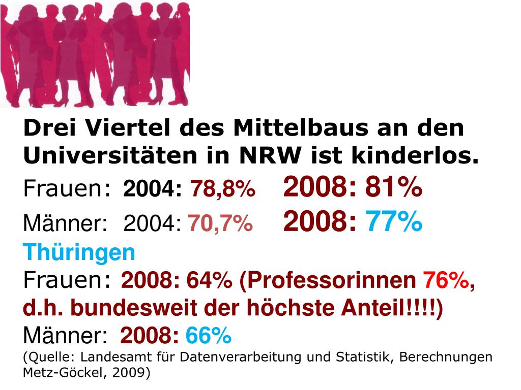 Drei Viertel des Mittelbaus an den Universitäten in NRW ist kinderlos. Frauen:2004:78,8% 2008: 81% Männer:2004: 70,7% 2008: 77% Thüringen Frauen: 2008: 64% (Professorinnen 76%, d.h. bundesweit der höchste Anteil!!!!) Männer: 2008: 66% (Quelle: Landesamt für Datenverarbeitung und Statistik, Berechnungen Metz-Göckel, 2009)