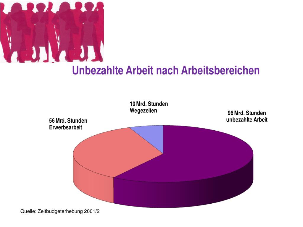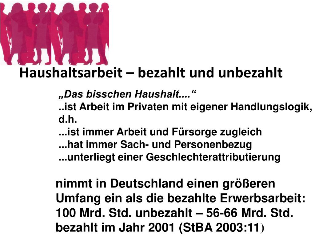 Haushaltsarbeit – bezahlt und unbezahlt „Das bisschen Haushalt....“ ..ist Arbeit im Privaten mit eigener Handlungslogik, d.h. ...ist immer Arbeit und Fürsorge zugleich ...hat immer Sach- und Personenbezug ...unterliegt einer Geschlechterattributierung nimmt in Deutschland einen größeren Umfang ein als die bezahlte Erwerbsarbeit: 100 Mrd. Std. unbezahlt – 56-66 Mrd. Std. bezahlt im Jahr 2001 (StBA 2003:11)