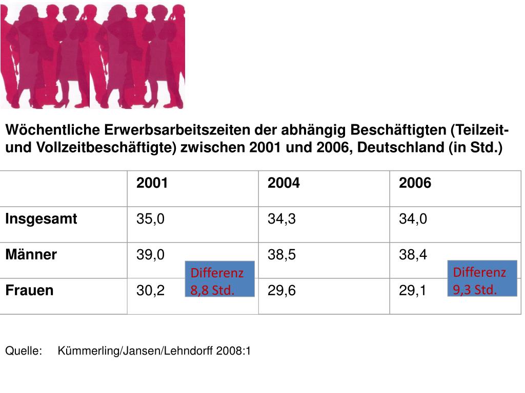 2001 2004 2006 Insgesamt 35,0 34,3 34,0 Männer 39,0 38,5 38,4 Differenz 8,8 Std. Frauen 30,2 29,6 29,1 Wöchentliche Erwerbsarbeitszeiten der abhängig Beschäftigten (Teilzeit- und Vollzeitbeschäftigte) zwischen 2001 und 2006, Deutschland (in Std.) Differenz 9,3 Std. Quelle: Kümmerling/Jansen/Lehndorff 2008:1