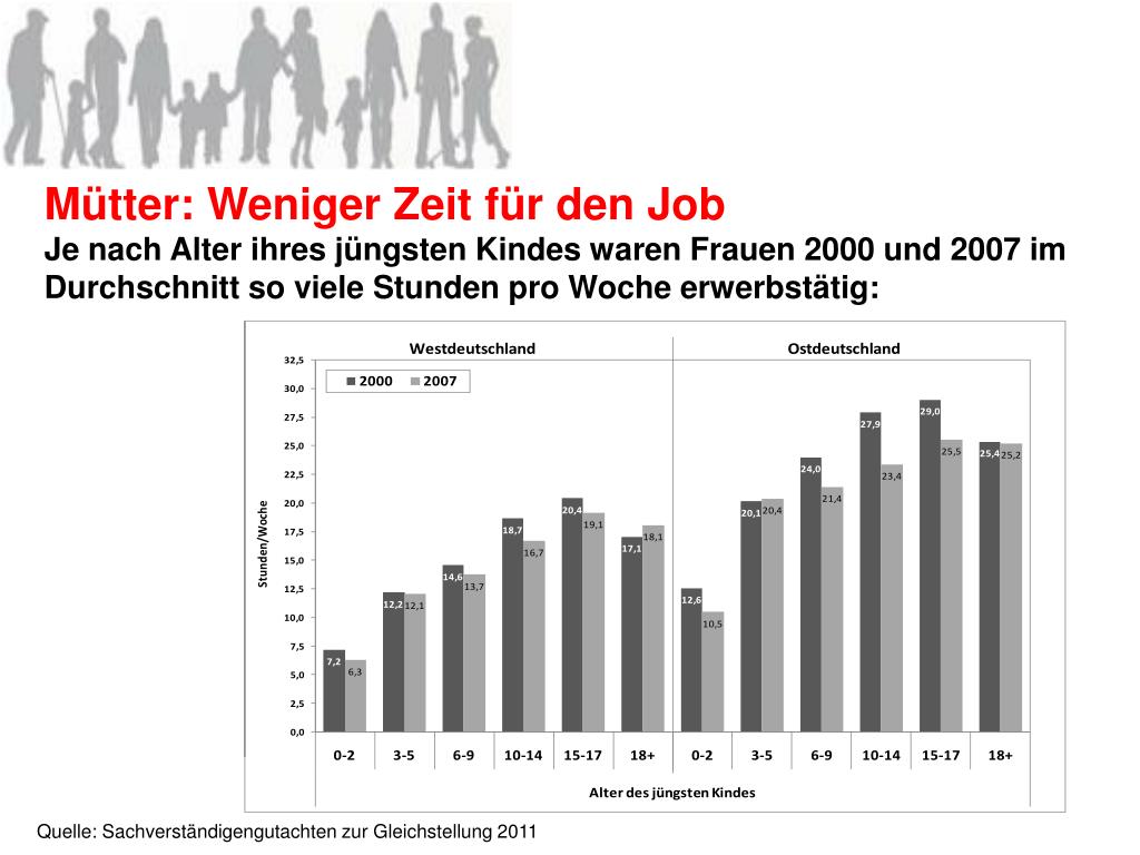 Mütter: Weniger Zeit für den Job Je nach Alter ihres jüngsten Kindes waren Frauen 2000 und 2007 im Durchschnitt so viele Stunden pro Woche erwerbstätig: Quelle: Sachverständigengutachten zur Gleichstellung 2011