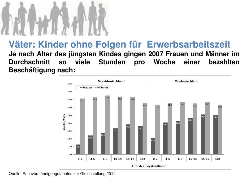 Väter: Kinder ohne Folgen für Erwerbsarbeitszeit Je nach Alter des jüngsten Kindes gingen 2007 Frauen und Männer im Durchschnitt so viele Stunden pro Woche einer bezahlten Beschäftigung nach: Quelle: Sachverständigengutachten zur Gleichstellung 2011