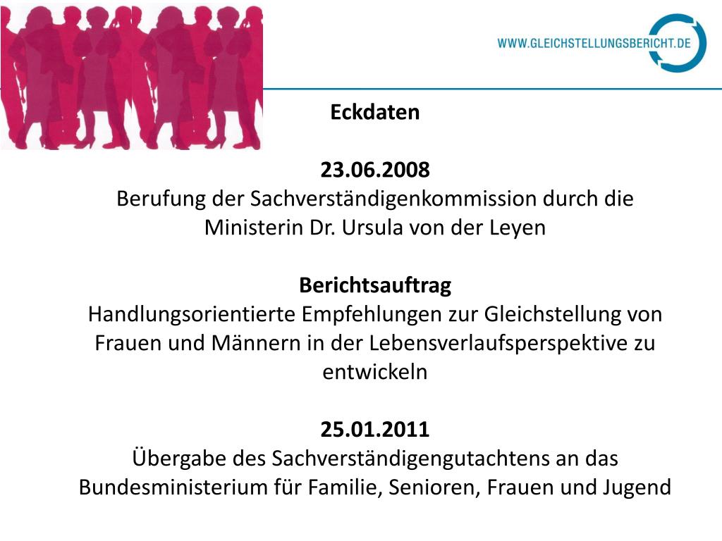 Eckdaten23.06.2008Berufung der Sachverständigenkommission durch die Ministerin Dr. Ursula von der LeyenBerichtsauftragHandlungsorientierte Empfehlungen zur Gleichstellung von Frauen und Männern in der Lebensverlaufsperspektive zu entwickeln25.01.2011Übergabe des Sachverständigengutachtens an das Bundesministerium für Familie, Senioren, Frauen und Jugend