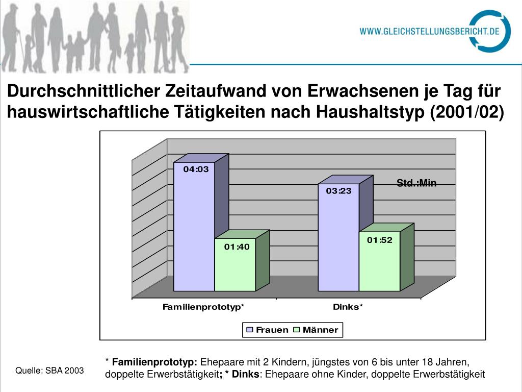 Durchschnittlicher Zeitaufwand von Erwachsenen je Tag für hauswirtschaftliche Tätigkeiten nach Haushaltstyp (2001/02) Std.:Min * Familienprototyp: Ehepaare mit 2 Kindern, jüngstes von 6 bis unter 18 Jahren, doppelte Erwerbstätigkeit; * Dinks: Ehepaare ohne Kinder, doppelte Erwerbstätigkeit Quelle: SBA 2003