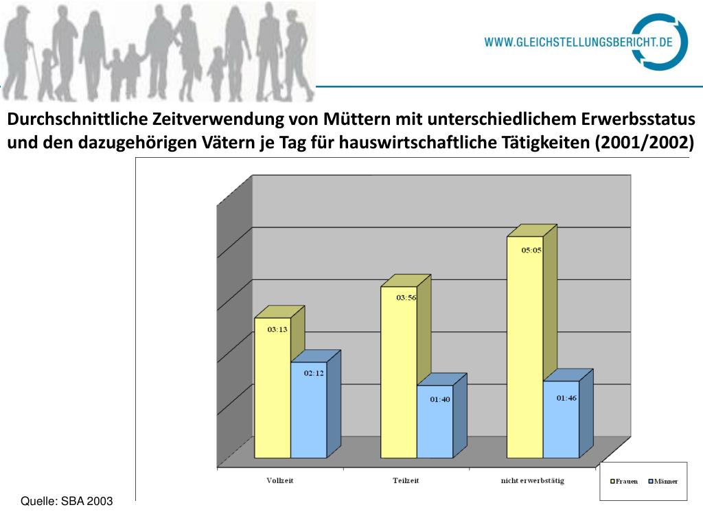 Durchschnittliche Zeitverwendung von Müttern mit unterschiedlichem Erwerbsstatus und den dazugehörigen Vätern je Tag für hauswirtschaftliche Tätigkeiten (2001/2002) Quelle: SBA 2003